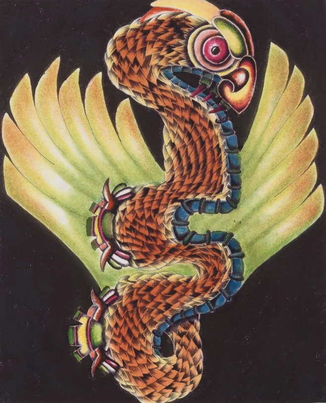 Jack Morris, Quetzalcoatl, 2014, pen, pastel, and peanut butter oil 11” x 8’’ (27.9 x 20.3 cm)